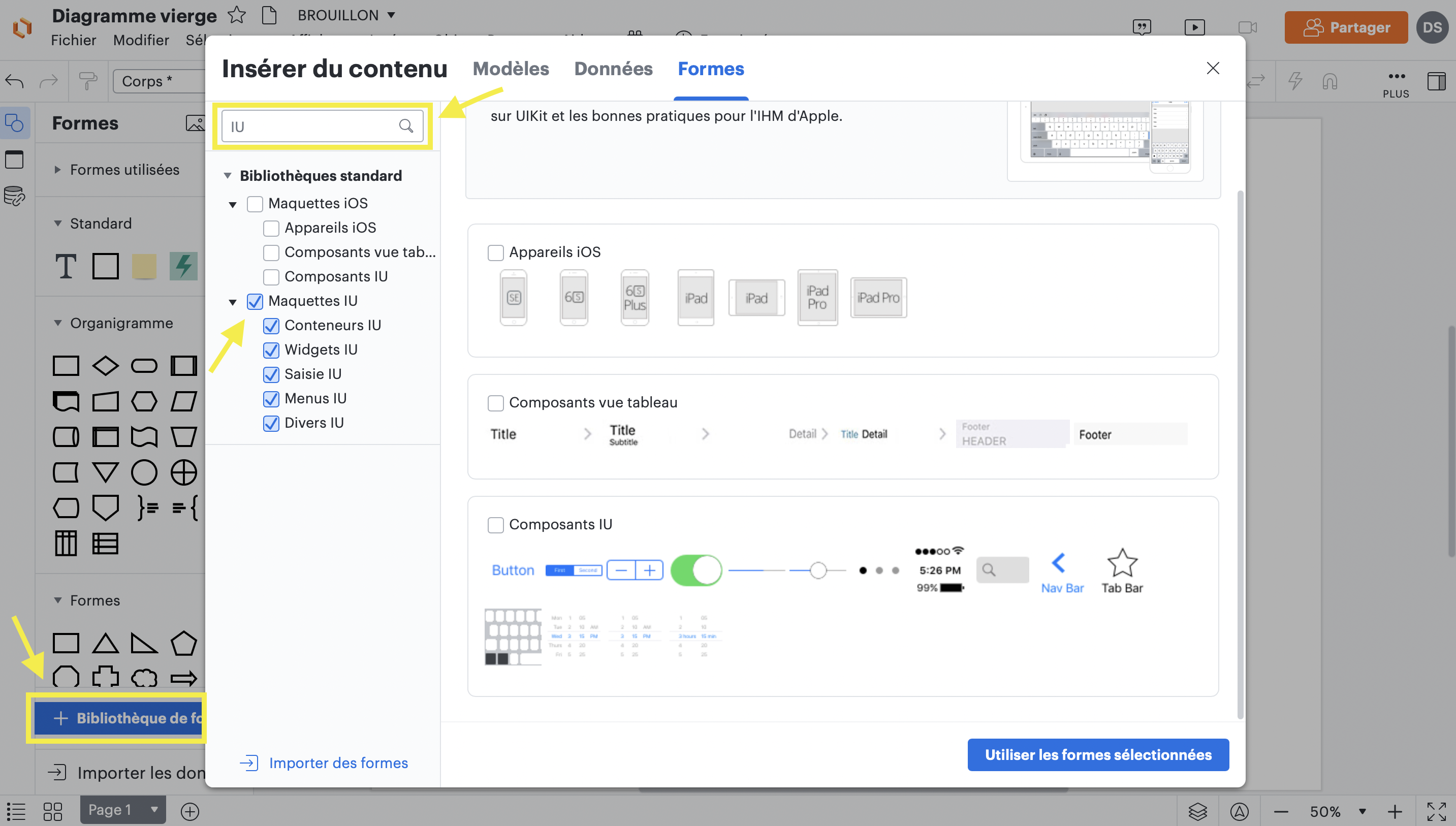 Nous ajoutons donc une ou plusieurs catégorie(s) de formes que nous retrouvons dans la bibliothèques de formes.
