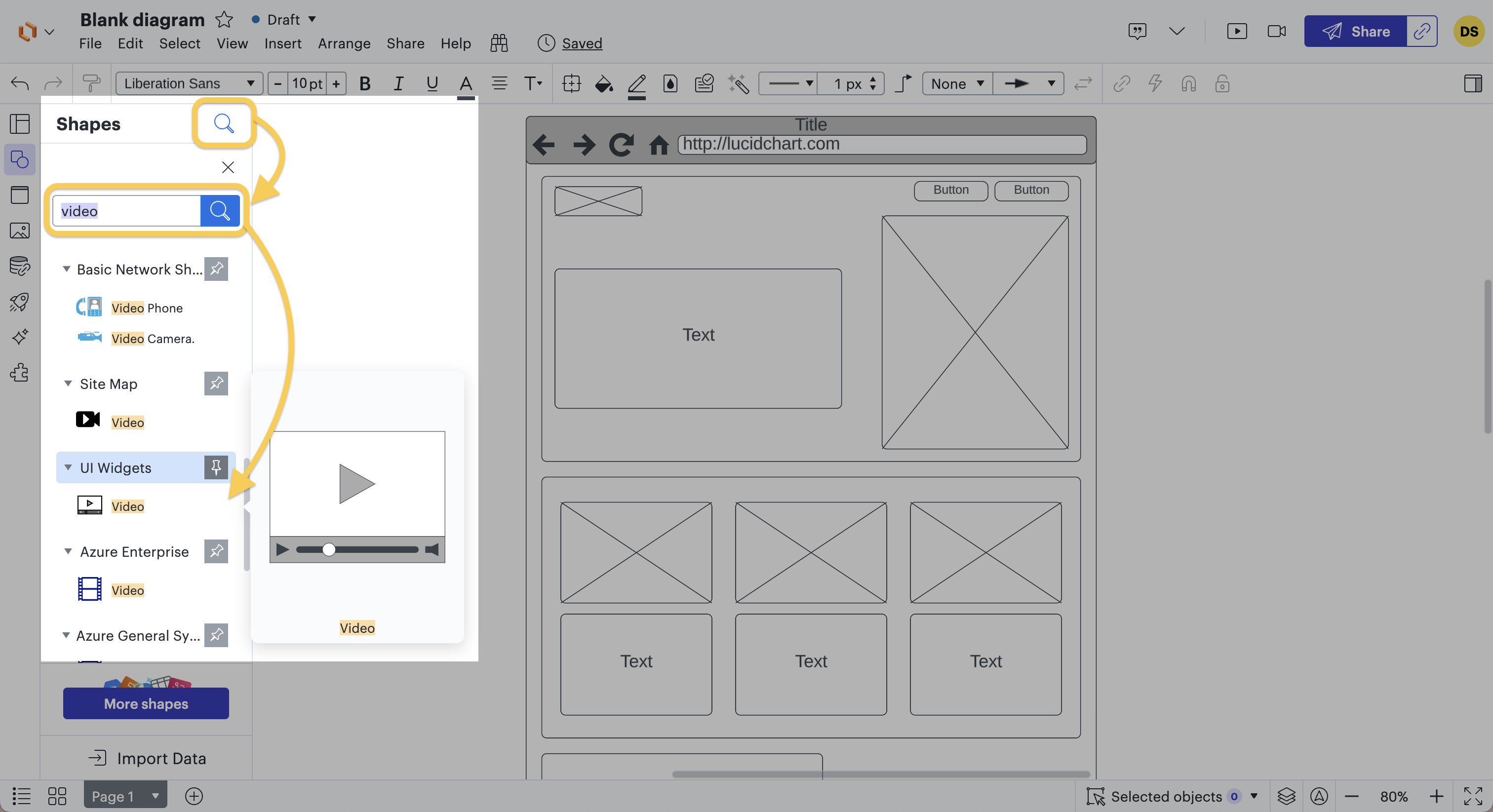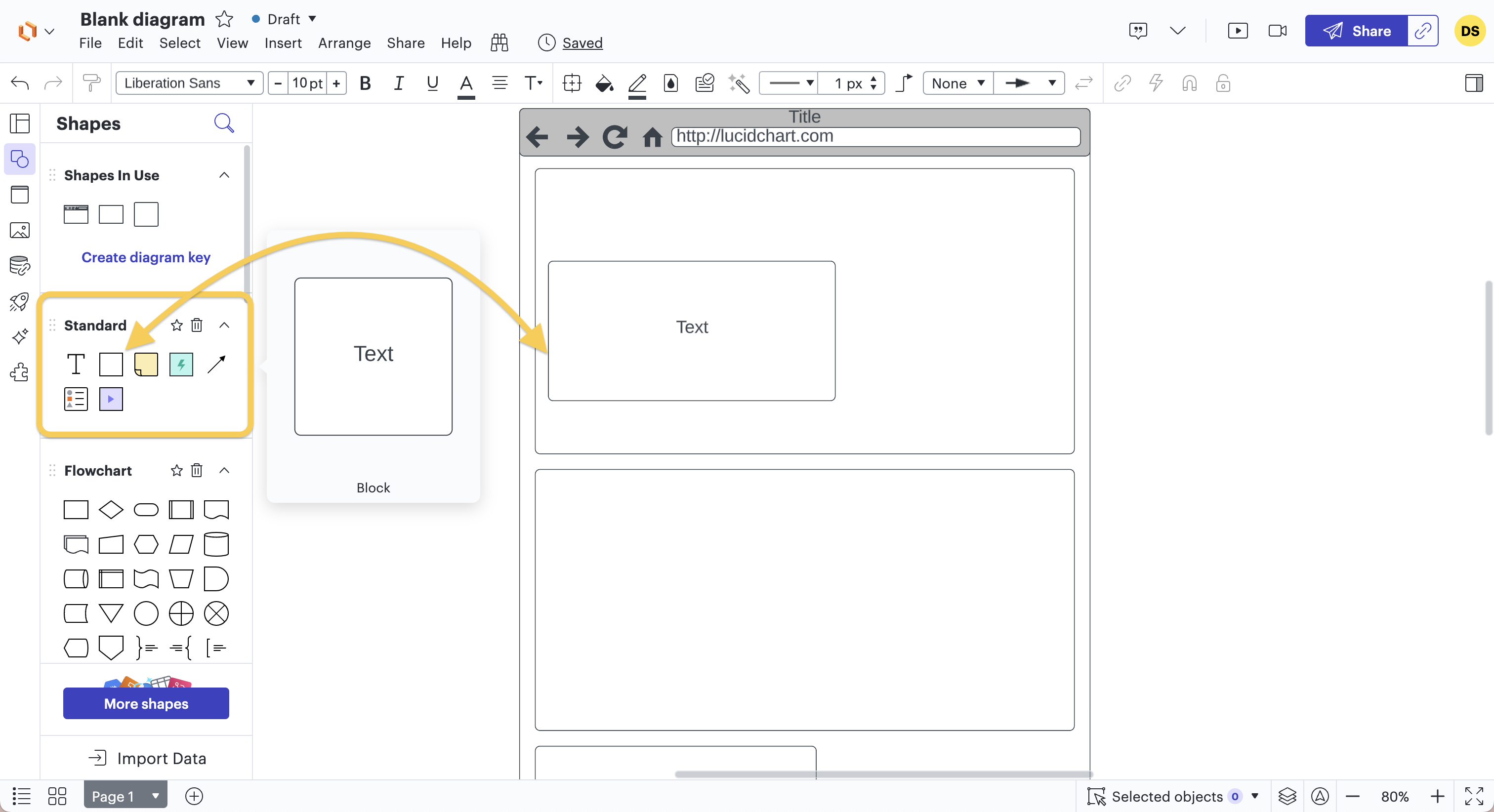 Une fois sur notre document vierge, nous avons déjà accès à certaines formes standards, dans la barre de gauche, qui nous permettront de construire notre wireframe. Néanmoins, ces formes sont limitées et ne nous permettront donc pas de schématiser un grand nombres d’éléments sur la page blanche.